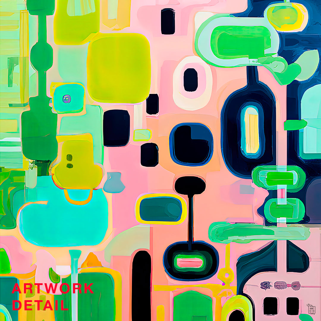‘Verge’ straddles the line between city structure and natural calm. Lime greens, lush aquas, midnight blues and soft pinks create a digitally remixed parkland vibe, like urban maps reimagined in code. Bold yet grounding, it’s art you can sink into. ‘Verge’ transforms reading nooks, family lounges, or even your holiday home retreat into colourful spaces to pause and recharge.