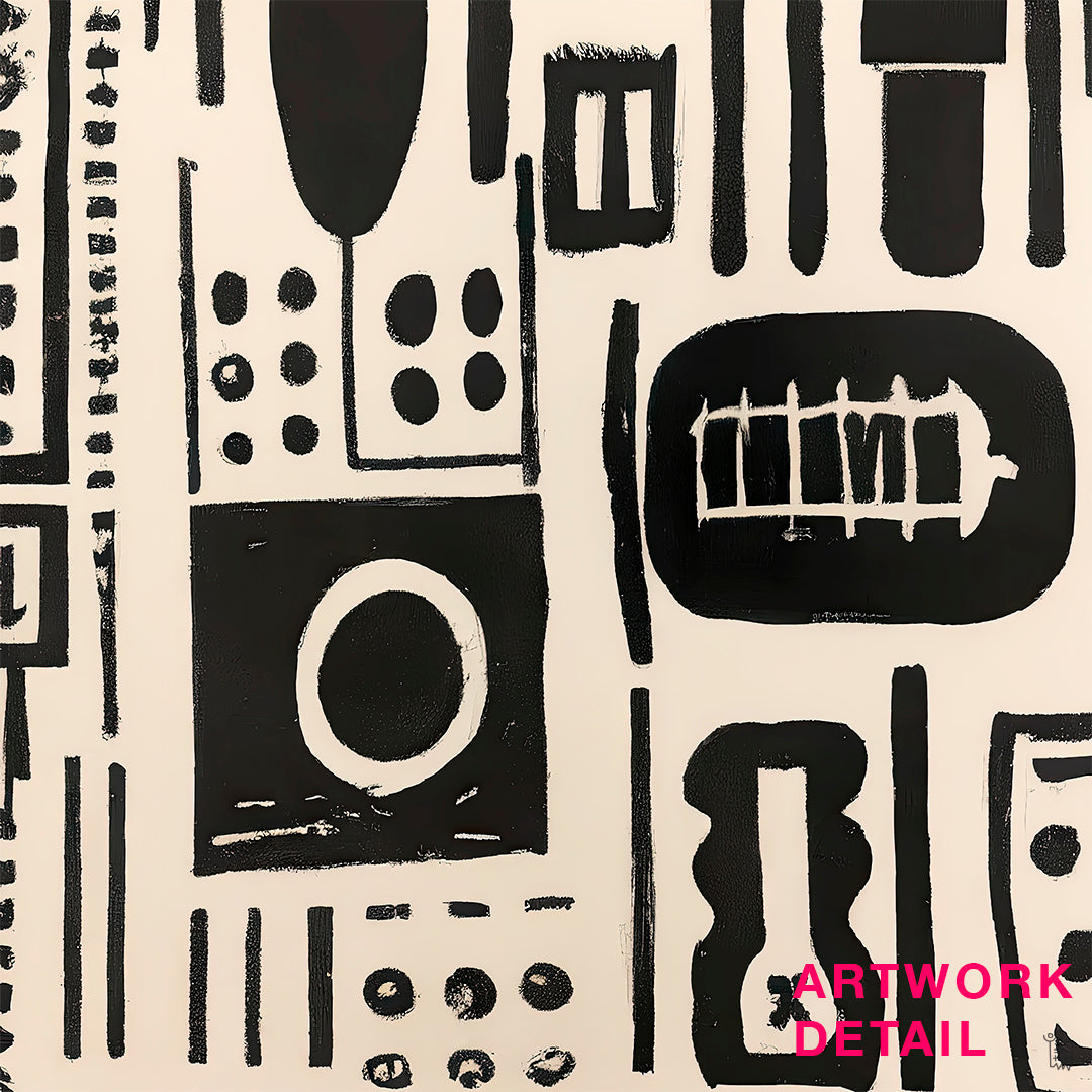 ‘Signal’ channels visual language from deep within, the kind you feel before you read. Its hand-stamped motifs echo modern hieroglyphs, abstract codes, and urban marks. Monochrome black shapes on a soft neutral backdrop play with repetition, alignment, and rhythm. Send a strong signal...bring graphic clarity and artisan energy into your home with ‘Signal’. LIMITED EDITION x 50 ONLY each sizing